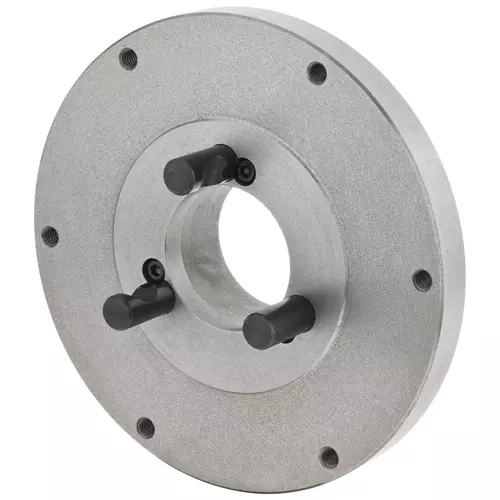 These mounting plates are precision-machined to fit the spindle nose on your lathe. For maximum accuracy, mount the plate on the machine spindle nose, place a dial indicator on the chuck side face of the adapter close to the mounting holes, rotate the adapter and if the total indicator reading (TIR) exceeds 0.0005", take a light truing cut across the face of the mounting plate.
