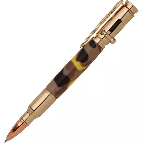 This Bolt Action pen will be hard for any hunting or target-shooting enthusiast to put down. Every detail, from the one of a kind bolt action mechanism to the precision engineered components, was carefully designed to ensure uniqueness and reliability. The bolt action handle smoothly advances and retracts to securely lock the refill in place. Includes a bolt action rifle clip, a replica 30 caliber cartridge, and a rose gold bullet tip for added authenticity. Pen blank and bushing set not included. See our wide selection of blanks to complement this pen: T28720-T28733 & T28776-T28779