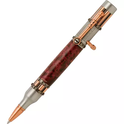 This pen kit is straight out of Victorian science fiction and the industrialized 19th century. This pen is all about mixing the old and the new: fusing the usability of modern technology with the aesthetic of the Victorian age. The kit combines flat head screws, riveted design patterns, replica Gattling gun barrels, a Bolt Action mechanism plus a mix of antique copper, brass, and pewter finishes. Smooth writing performance with a Parker style refill. Pen blank and bushing set not included. See our wide selection of blanks to complement this pen: T28720-T28733 & T28776-T28779