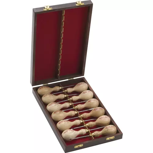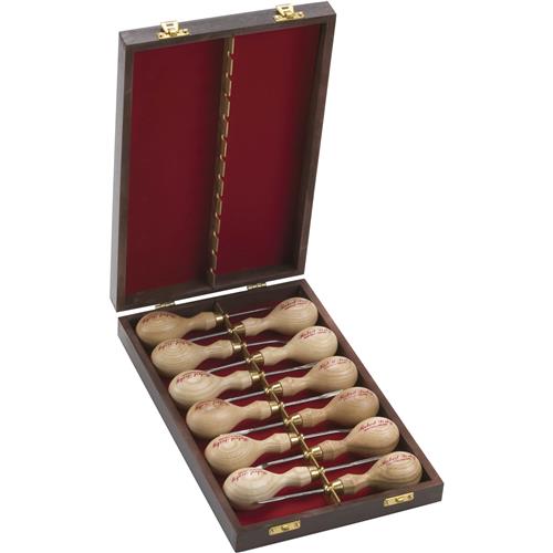 The full range of 12 tools is available in a polished wooden case. When not in use the tools are ‘topped and tailed’ for carrying. During use, the case makes a very useful free-standing tool cabinet. The provision of additional slots in each of the two brass hanging rails allows the tools to be safely suspended and easily accessible.Contact Robert Sorby regarding questions or warranties about their products.