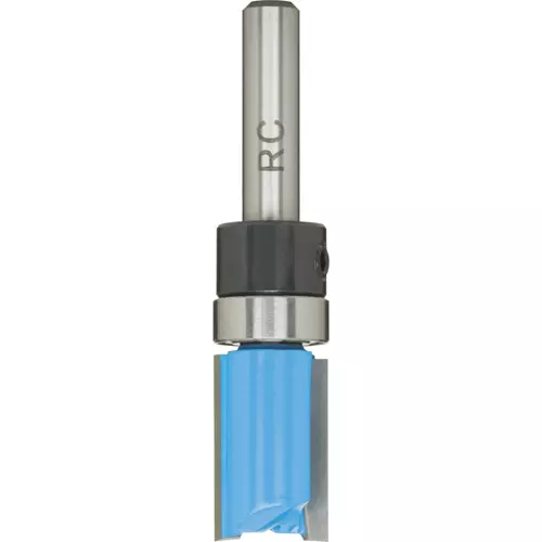A versatile double-fluted straight router bit for pattern cutting when pattern is mounted on top of the workpiece.