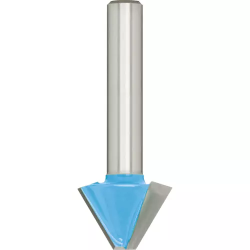 Double fluted bit trims high-pressure laminates at a 30 Degree beveled edge. For use with trimmers with a built-in edge guide.