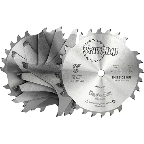 This premium dado set from SawStop features 24-tooth main blades, flat grind chippers, and a -5° hook.