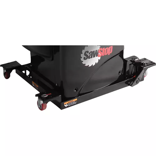 Supports saw and extension table, no additional extension hardware needed. 1000 lb capacity, no flimsy wheel brakes, and non-marring polyurethane wheels. When disengaged, the saw rests firmly on the ground distributing weight directly to the floor, not the wheels. Assembly includes kit to adapt Industrial Mobile Base for use with SawStop Professional Cabinet Saw.