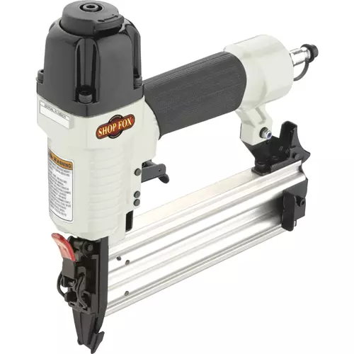 This nail gun accepts up to 100 5/8"–2" brads, operates on 60-100 PSI, and features a 360 degree adjustable exhaust