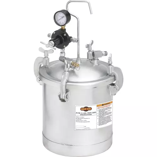 With a 2-1/4 Gallon capacity, this Paint Tank features a galvanized steel tank, double output regulator and pressure relief/safety valve. Lid gasket and clamps stay attached during lid removal.