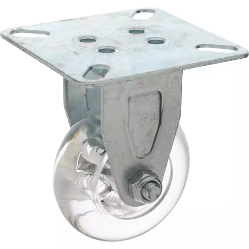 These non-marring casters feature ball bearing swivels and high density clear plastic wheels. All have mounting plate dimensions of 60mmx60mm and distances between mounting holes of 43mmx43mm on centers. Choose between three wheel sizes, each with or without foot brakes. Mounting screws not included. 2" wheels have a 55 lb. capacity, 3" height to mounting plate.