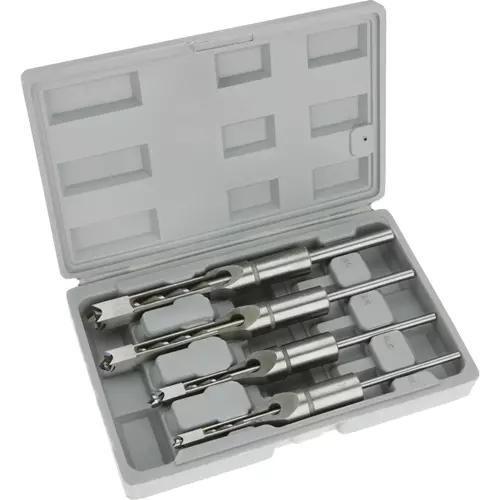 These Mortising Chisels are great for drilling square holes in wood with a mortising machine or a mortising attachment (not included). Set of 4 includes the following sizes: 1/4", 5/16", 3/8" and 1/2". This quality set also comes with a convenient plastic storage case. Fits mortising attachments with 3/4" collars.
