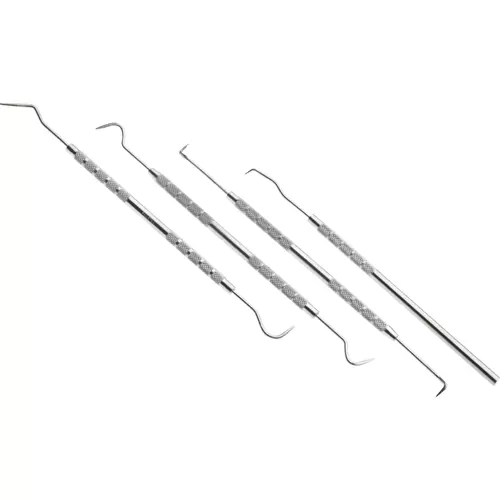 This stainless steel Pick Set is perfect for a variety of uses around the shop - whether restoring cut threads or fine scribing. Each pick features two different pick styles, a knurled handle and measures 6-1/2" long. Set includes protective pouch.