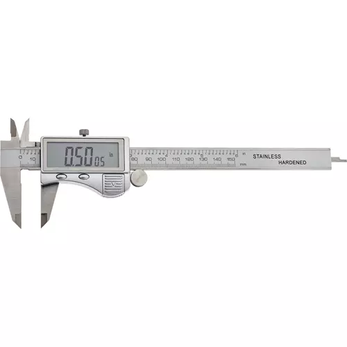These 6" Digital Calipers let you switch between decimal and fractional inches and millimeters. Large digital readout makes precision measurements easy with a resolution of 0.0005". Features include hardened stainless steel jaws and beam, thumb roll, lock knob, zero reset button and an absolute and relative measurement function.