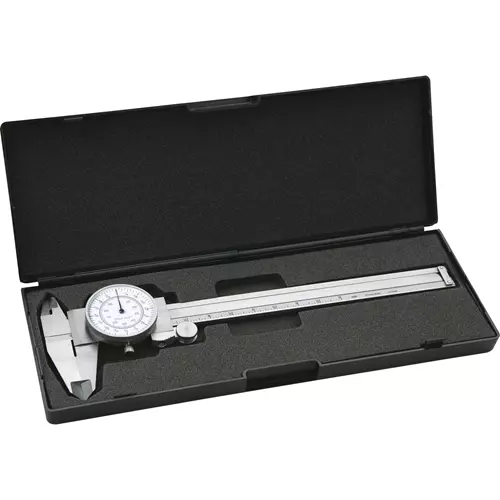 Combines metalworking precision with a fractional scale for woodworkers. Perfect for measuring board thickness, depth and inside dimensions. Dial reads 64ths and .01".