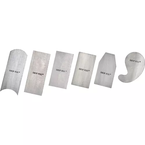 Properly sharpened scrapers remove tool marks and finish wood surfaces much better than sandpaper because the wood fibers are shaved rather than abraded. This 6-pc Scraper Set includes fine, medium, and heavy cutting rectangular shapers, concave/convex scraper, gooseneck scraper and beveled edge scraper. Two of the scrapers have rounded edges to prevent accidental gouging. Cutting edges are renewable by simply squaring with a file and burnishing a slight hook angle.