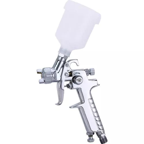 HVLP technology delivers higher transfer efficiency, reducing overspray while lowering material costs. This Mini HVLP Spray Gun is great for auto body touch-ups or projects requiring a smaller volume of material and handles a wide range of oil based materials. Plastic cup allows easy viewing of material level.