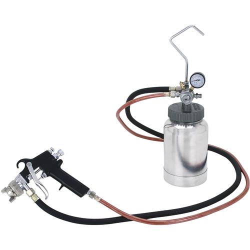This set has a two-liter pressurized paint cup with a built-in regulator and hook-type handle for easy use.
