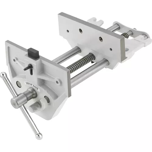 This vise features a quick release that disengages the screw for speedy adjustment. Simply throw the lever, slide the jaw in or out and finish by turning the handle clockwise for super holding control. Features heavy cast-iron construction, polished guide rods, Acme screw and sliding dog. Has 9" jaws and a 10-1/4" maximum opening. Includes screws for mounting shop-made wood jaw faces.