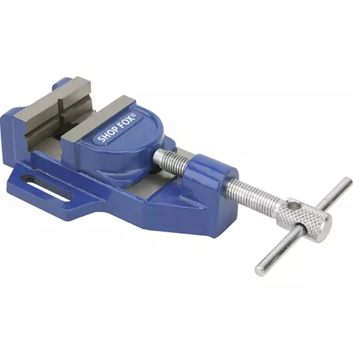 Precision milled cast iron Tilting Jaw Drill Press Vises feature a tilting head that allows the vise to clamp any nonparallel part and automatically equalize the pressure. A large knurled handle allows quick adjustments and includes a bi-positional bar handle for plenty of torque. Both jaws have horizontal and vertical grooves for holding round stock. Includes a sturdy lip along both sides of the base, allowing vise to be mounted to nearly any machine table, using common T-slot clamps.
