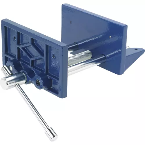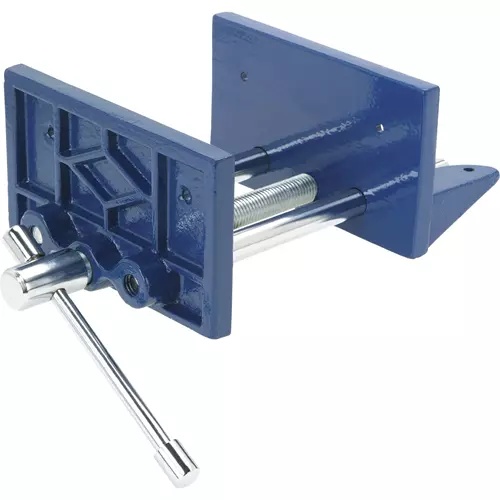 The cold rolled-steel wood vise features precision-machined castings with perfectly aligned guide bars.