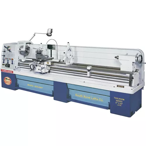The SB1048PF 21" x 120" Turn-Nado Gearhead Lathe is driven by a fixed speed 15 HP motor with quick-change gear levers to control the 16 spindle speeds between 20–1600 RPM.