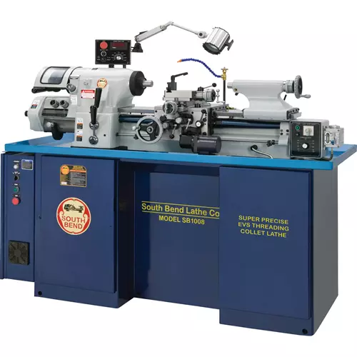 Sale price limited to stock on handSpindle runout within 0.00125 mm (50 millionths of an inch) Hardened and ground spindle mounted on high-precision angular-contact bearings for sustained precision and rigidity Infinitely variable spindle speed between 50-4000 RPM 3 HP motor with current-vector inverter drive for increased low-end torque Fast lever-action collet closer Independent variable feeds for carriage and cross slide Turcite B slideway bearing surface between carriage and bed Quick change inch and metric gearbox Inch and metric dual dials Automatic threading stop and control High-quality Japanese Yaskawa Inverter An ideal machine for super high-precision work on small parts using 5-C collets 5-C bar stock diameter up to 1.0625" Built to extremely high South Bend standards for industrial-duty use. Swing over bed: 11" Distance between centers: 18" Swing over cross slide: 5.98" Swing over saddle: 9.05" Cross slide travel: 6" Compound travel: 3" Carriage travel: 25" Spindle nose: 5-C (10°) Spindle bore: 1.25" Spindle taper: 4° Spindle speeds w/ 5-C: 50-4000 RPM Spindle speed w/ 6" 3-Jaw Chuck: 50-3000 RPM Tailstock taper MT #2 Tailstock travel : 3.75" Tailstock barrel diameter: 1.358" Inch threads: 11-108 TPI Metric threads: 0.275-2.7 mm Modular pitches: N/A Diametral pitches: N/A Number of longitudinal feeds: Variable Longitudinal feed range: 0.3125"-7"/min Number of cross feeds: Variable Cross feed range: 0.1875"-4"/min Voltage/phase/amps: 220V, 3-Phase, 10A Spindle motor: 3 HP Coolant motor: 1/8 HP Feed inverter motor: 1/2 HP Machine footprint : 59" x 25" Approximate shipping weight: 2004 lbs.