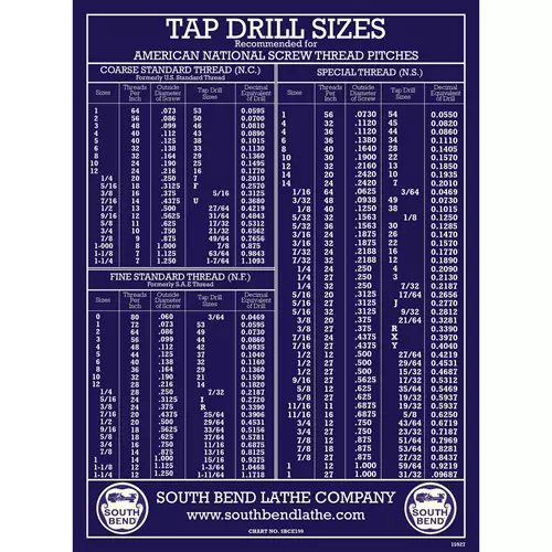 Chart provides screw sizes, TPI, screw OD sizes, tap drill sizes and decimal equivalents of drill.
