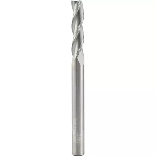 Three flute spiral upcut finishers are designed to improve the finished bottom edges at feed rates similar to two flute spiral speeds. May increase tool life compared to two flute tools. Upcut forces improve chip evacuation. General purpose applications. These tools cut wood composites, solid surface and natural wood.
