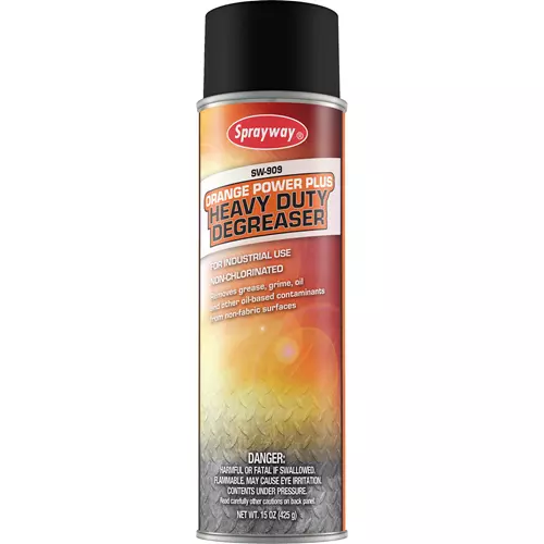 Sprayway's Orange Power Plus Heavy Duty Degreaser is a biodegradable and non-chlorinated solvent degreaser. The high solvency action penetrates most grease and oil deposits (97% d-limonene formula). Use for engine degreasing, adhesive removal, brake cleaning, tool cleanup, parts cleaning and graffiti (paint) removal.