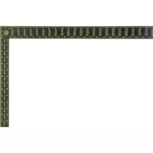A carpenter's square made with extra thick aircraft grade aluminum for durability and maintaining accurate square, each one individually inspected for accuracy. Deep graduations are filled with yellow paint for superior readability in all light conditions and surface protected to resist corrosion. Graduations are in 1/16", 1/10", and 1/12" on the back, "1/16 and 1/8" on the face. Beam Length 16" and Beam Width 1-1/2".
