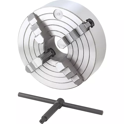 "Independent" means that each jaw moves independently. Such 4-Jaw Chucks are used for holding odd shaped pieces or where zero tolerance is required. This 10" 4-jaw chuck with a 2-1/2" bore has semi-steel bodies and hardened reversible jaws. Requires a mounting plate. Note the mounting holes through the back of the chuck. This is because each jaw moves independently and there is no scroll in the middle.