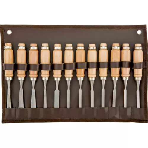 This complete Carving Chisel Set comes protected in a tough leather roll-up pouch and features beech wood handles with steel ferrules. Set includes: 6mm Straight, 12mm Straight, 10mm V-Tool, 6mm Right Skew, 6mm Double Skew, 8mm Gouge, 10mm Gouge, 14mm Gouge, 6mm Spoon, 6mm Beading, 6mm Round Nose, 6mm V-Gro. Each chisel measure 190mm overall.