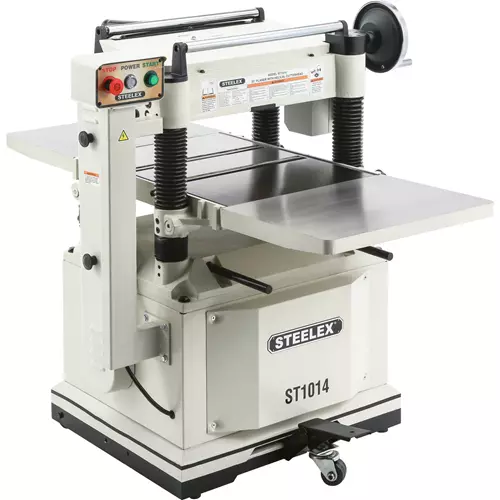With its built-in locking mobile base and pedestal-mounted switch, this 20" Helical Cutterhead Planer is easy to move and operate. Just press down on the lever with your foot to release the lock, and this planer is mobile. Features an extra-long 55-5/8" precision-ground cast-iron table, two feed speeds, board return rollers, a 20" x 8" capacity, adjustable bed rollers, magnetic switch with thermal-overload protection, and a 5 HP motor.