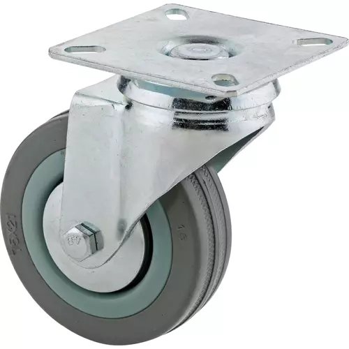Gray rubber tire is ribbed for sure footed wheeling even on wet surfaces.