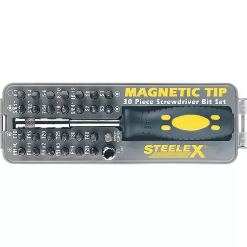 Ergonomic handle produces tremendous torque and features a magnetic socket tip for interchanging hex bits and adapters. Magnetic force holds screws on the bit for third-hand convenience. Includes 26 bits of assorted sizes like Phillips®, straight, Torx®, hex drive and square drive, plus a 1/4" socket adapter, bit holder, and case.