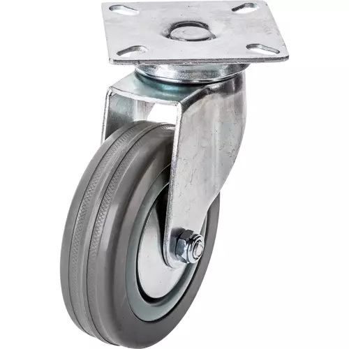 Gray rubber tire is ribbed for sure footed wheeling even on wet surfaces.