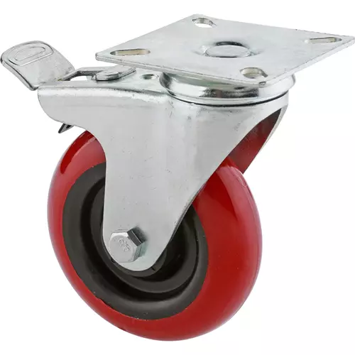 Red, high visibility, polyurethane tire is molded onto a hard rubber hub.