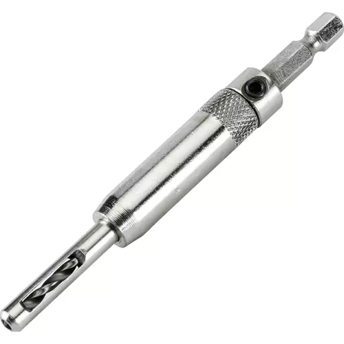 Drill perfectly aligned hinge screw holes. Self centering, spring loaded drill bits are guided by the hinge screw holes. Hex shanks fit all quick-change drill/drive systems. Sold as single.
