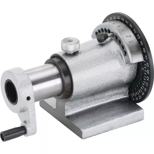 Fitted with a traveling spindle and collar, the 5-C Spin Index is unmatched for forming, grinding, and inspecting end mills and other fluted cutting tools. This spin index accepts 5-C collets up to 1-1/8" capacity and features a 36-hole indexing plate with 10 vernier holes for indexing to 1 degree. Locking spindle is hardened and ground and has 2-1/16" of travel.
