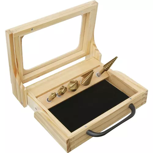 This TiN-coated D3730 5-piece Step Drill and Countersink Set includes a metric step drill, a fractional step drill, and three 5-flute countersinks.