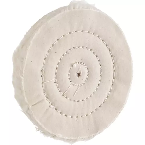 Soft feather-edged muslin is concentrically stiched together near the center, leaving the outer edge to provide a fine polishing surface. Perfect for stainless steel, chrome, gold or silver.