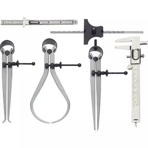 - Includes: 6" inside caliper, 6"outside caliper, 6" straight dividers, 6" scale with pocket clip with a fractional equivalent on back, 5" vernier caliper with a millimeters scale on back, and 5" depth gauge with a millimeters scale on back