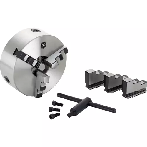This 8" 3-Jaw, Self-Centering Chuck with a 2.55" bore features semi-steel bodies with plain backs. Includes two sets of jaws, a wrench and mounting screws. Requires a mounting plate. For those of you who are not familiar with chuck mounting, "plain back" means that a backing plate is required to mount the chuck to your lathe. Since there are so many different types of spindles on lathes, you would require a back plate that fits your lathe spindle and then mount the chuck to the plate. The mounting bolts go through the back of the plate into the back of the chuck, usually on the edge of the chuck since there is a scroll mechanism for self centering the jaws.