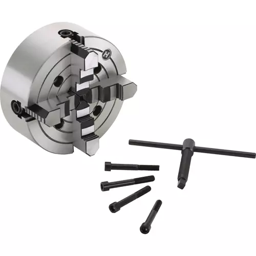 "Independent" means that each jaw moves independently. Such 4-jaw chucks are used for holding odd shaped pieces or where zero tolerance is required. This 4-jaw chuck has a semi-steel body and hardened reversible jaws. Requires a mounting plate. Note the mounting holes are through the front of the chuck. This is because each jaw moves independently and there is no scroll in the middle. Bore: 1-15/16"