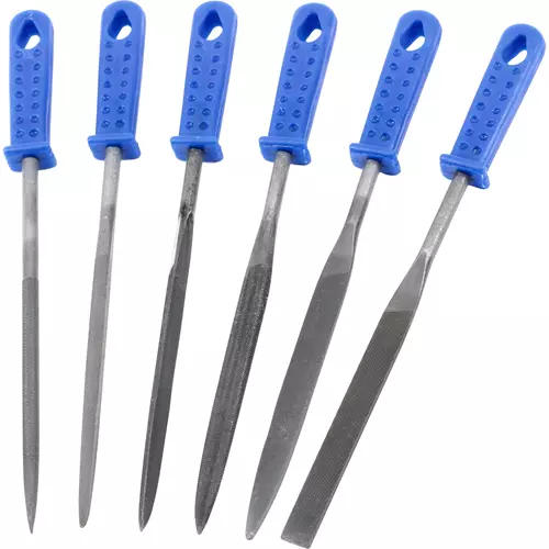 For delicate work, this Mini File Set includes an assortment of oval, flat, half round, round, triangular and square files with comfortable handles.