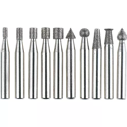 These 1/4" shank 150 grit burrs work well in drills and die grinders and feature the 10 most popular burr profiles. This set comes in a nice plastic case for easy storage. Maximum 20,000 RPM.