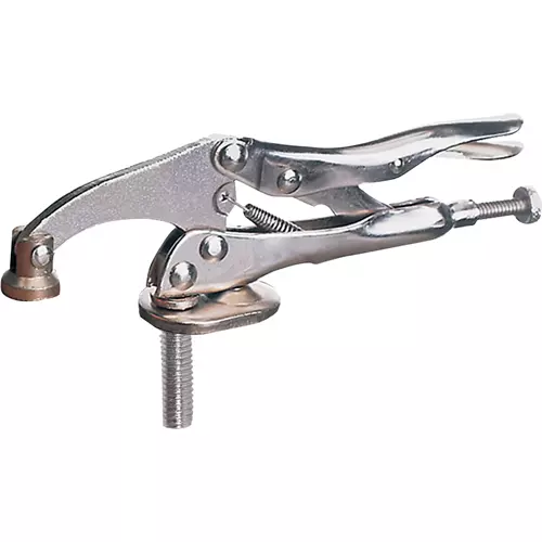Hold down your work on your drill press. Mounts with a threaded screw that goes through the slot on your drill press table and works just like regular locking pliers. Clamping range 0" - 4 1/4."