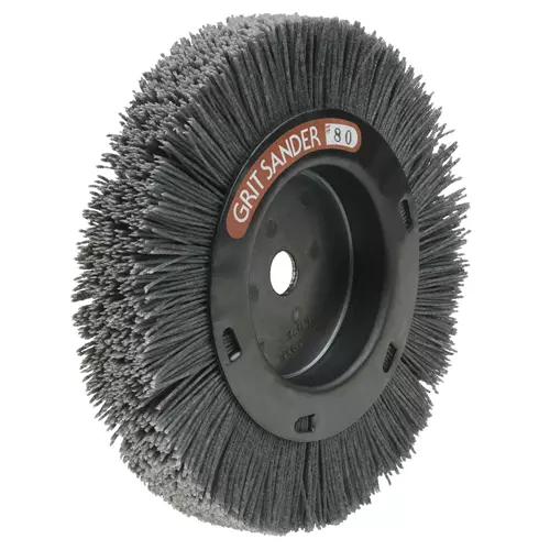 This stiff-bristled 80 grit wheel is coated with abrasive particles to sand irregular shapes and contours. This wheel mounts on a bench grinder and provides an efficient way to clean up rough edges on small spindles, carvings, etc. Worth every penny!