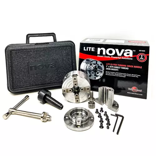 The NOVA 48306 LITE G3 Chuck Pen Turning Bundle includes the NOVA 48287 G3 LITE Direct Thread Chuck for 1" x 8TPI Spindles with 50mm jaws, NOVA 6034 Pen Plus Jaws, NOVA 9048 Mandrel Saver, chuck wrench, woodworm screw, fastenings and manual.