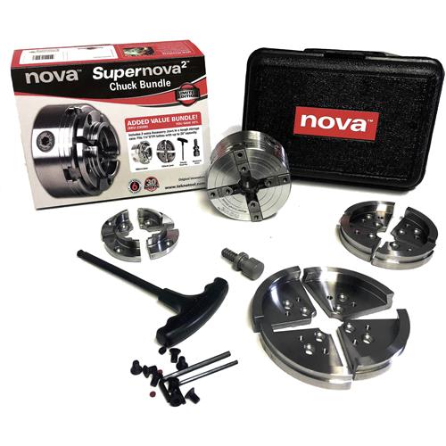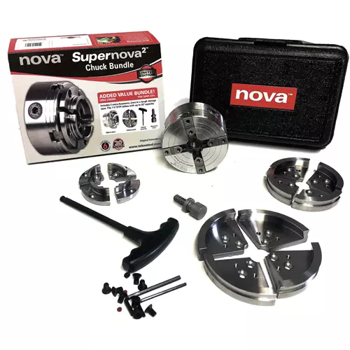The newest evolution of the classic Nova Chuck is finally available - the SuperNova2! Its nickel plated body is made from high grade K1045 steel machined to allow closer tolerances. Its patented gearing system delivers incredible gripping power and is over a third faster than the original SuperNova. With SuperNova2 gripping power you'll find yourself turning longer, more delicate stems. Large, rough and uneven work that you couldn't handle before can now be turned with greater security. The SuperNova2 requires only one hand to operate using a ball nosed Allen key with a large easy grip handle (included). It's quick to tighten and requires much less effort. The ball nose allows the handle to operate at an angle while tightening the chuck. The SuperNova2 has a fully sealed heavy duty backing plate made from Duracon 25 composite which is reinforced with stranded glass fiber. Backing plate design incorporates a 24 division index for future indexing accessories. All of the original Nova Chuck accessories, jaws and inserts are 100% compatible with the SuperNova2! The unique and user friendly features of this chuck prove it was designed by and for woodturners. Diameter of chuck is 3-7/8", depth is 3-3/8", weight 5-1/2 lb. Includes 50mm jaw set, T-bar, Allen wrenches, woodworm screw and manual. Requires a threaded body insert to fit your lathe.