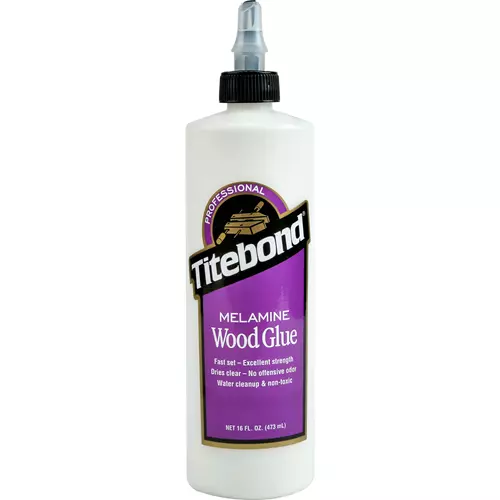 Titebond Melamine Glue is designed for bonding wood, particleboard, MDF, and other porous substrates to synthetic materials such as melamine, vinyl, and HPL as well as metals. It offers a fast initial tack, yet has a longer open time that allows for the accurate alignment of working materials. Titebond Melamine Glue is a water-based adhesive that is non-flammable, has low odor, dries clear, and cleans up with water. Its thicker formulation offers fewer runs and drips, making it easier to use and more effective for precise assemblies. 16 oz. bottle.