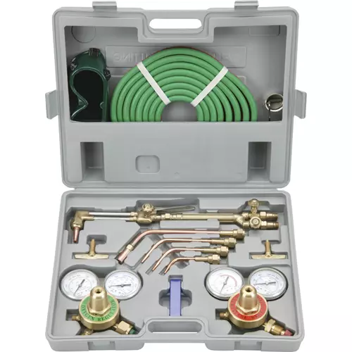 The T20228 Oxy-Acetylene Welding & Cutting Kit is made of quality brass and stainless steel and uses oxygen and acetylene gases for general-purpose welding and cutting. Weld up to 3/8" and cuts up to 6" of mild steel.