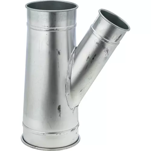 Galvanized branches used for dropping down from above & splitting main line. Long angle reduces suction loss. Made in the USA.